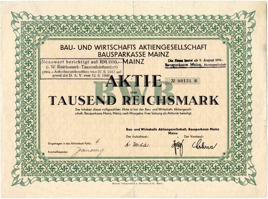 Inhaberaktie mit der Nummer 00131 im Nennwert von 1.000 Reichsmark. Format: 31,0 cm x 22,9 cm. Die ca. 1932 ausgegebene Emission umfasste 150 Aktien im Nennwert von jeweils 1.000 Reichsmark und belief sich damit auf einen Gesamtbetrag von 150.000 Reichsmark. Ein Bogen mit dem Gewinnanteilschein Nr. 20 nebst Erneuerungsschein ergänzt die Aktie. Stempel: „Der Firmenname lautet ab 9. August 1934: Bausparkasse Mainz, Aktiengesellschaft“ sowie „Nennwert berichtigt auf RM 1100,00“.